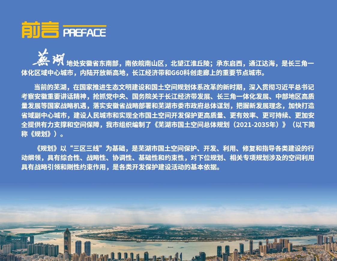 当前的芜湖,在国家推进生态文明建设和国士空间规划体系改革的新时期,深入贯彻习近平总书记考察安微重要讲话精神,抢抓党中央、国务院关于长江经济带发展、长三角一体化发展、中部地区高质量发展等国家战略机遇,落实安徽省战略部署和芜湖市委市政府总体谋划,把握新发展理念,加快打造省域副中心城市,建设人民城市和实现全市国土空间开发保护更高质量、更有效率、更可持续、更加安全提供有力支撑和空间保障,我市组织编制了《芜湖市国土空间总体规划(2021-2035年)》(以下简称《规划》)。