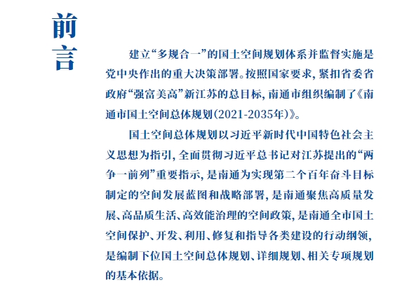 建立“多规合一”的国土空间规划体系并监督实施是党中央作出的重大决策部署。按照国家要求,紧扣省委省政府“强富美高”新江苏的总目标,南通市组织编制了《南通市国土空间总体规划(2021-2035年)》。