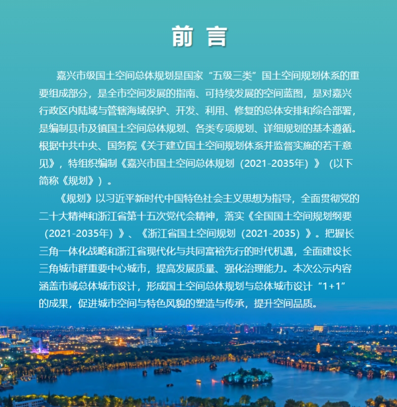 嘉兴市级国土空间总体规划是国家“五级三类”国土空间规划体系的重要组成部分,是全市空间发展的指南、可持续发展的空间蓝图,是对嘉兴行政区内陆域与管辖海域保护、开发、利用、修复的总体安排和综合部署,是编制县市及镇国土空间总体规划、各类专项规划、详细规划的基本遵循。