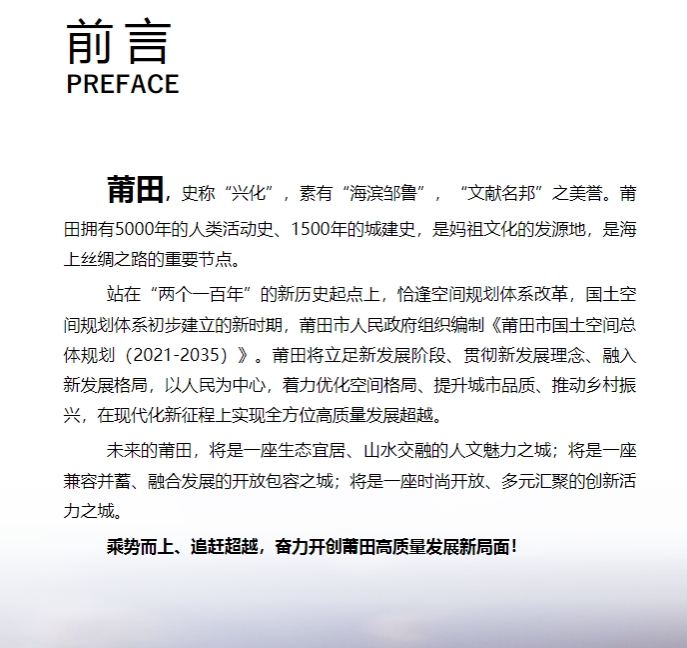 《莆田市国土空间总体规划(2021-2035)》以习近平新时代中国特色社会主义思想为指导,是城市落实新发展理念,实施高效能空间治理,促进高质量发展和高品质生活的空间政策,是莆田市域国土空间保护、开发、利用、修复和指导各类建设的行动纲领,也是编制市级专项规划和区县、乡镇等下位规划的基本依据。