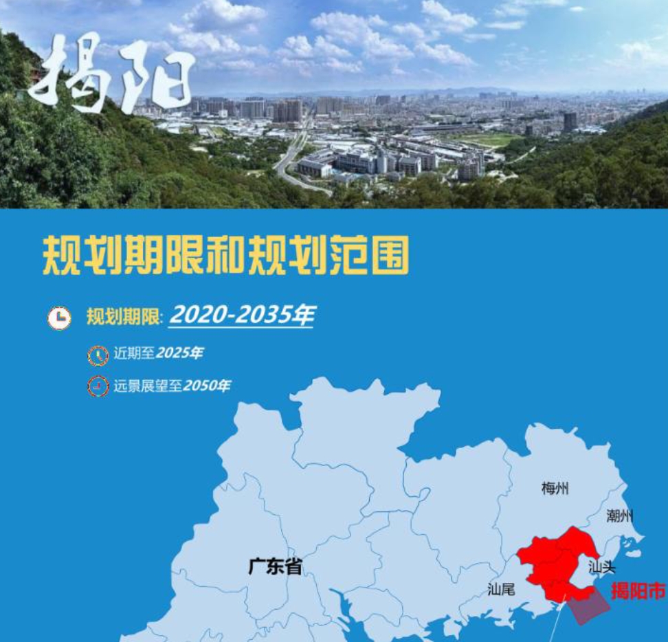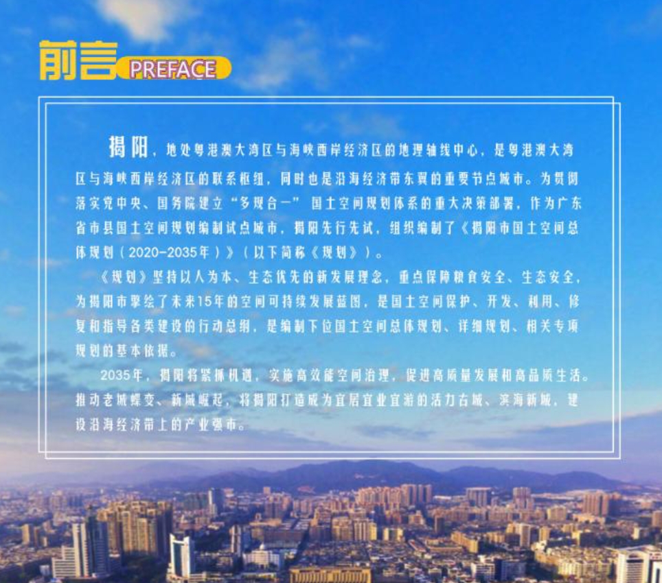揭阳,地处粤港澳大湾区与海峡西岸经济区的地理轴线中心,是粤港澳大湾区与海峡西岸经济区的联系枢纽,同时也是沿海经济带东翼的重要节点城市。为贯彻落实党中央、国务院建立“多规合一”国土空间规划体系的重大决策部罢,作为广东省市县国土空间规划编制试点城市,揭阳先行先试,组织编制了《揭阳市国土空间总体规划(2020-2035年)》(以下简称《规划》)。