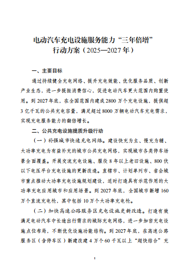 《电动汽车充电设施服务能力“三年倍增”行动方案(2025—2027年)》