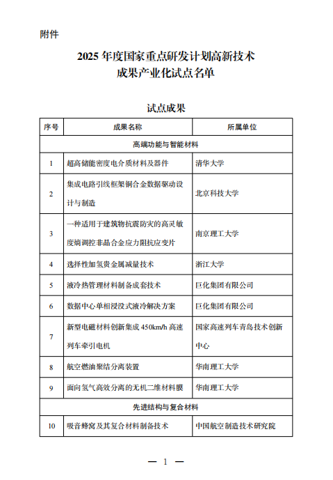2025年度国家重点研发计划高新技术成果产业化试点名单