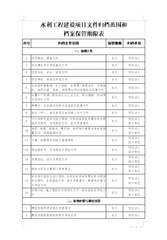水利工程建设项目文件归档范围和档案保管期限表