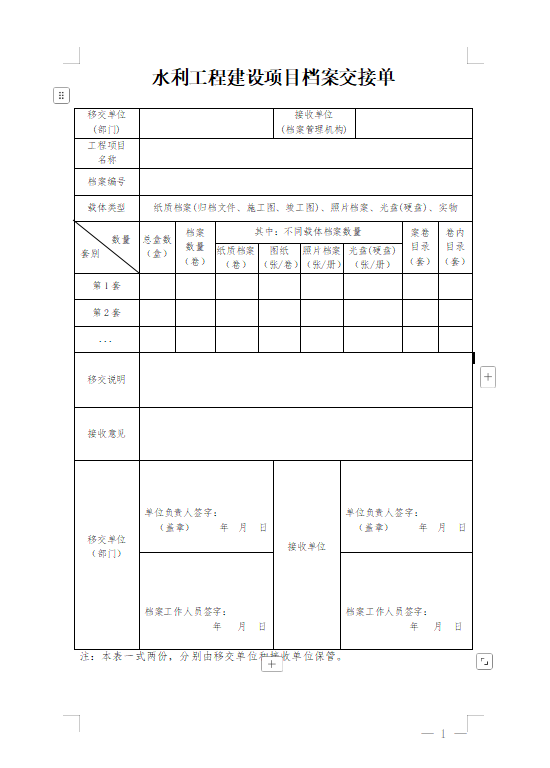 水利工程建设项目档案交接单