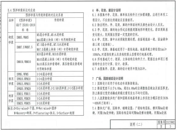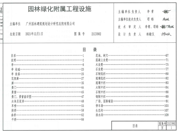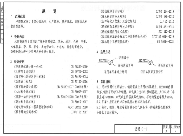 21ZJ902园林绿化附属工程设施中南标适用范围本图集适用于各类公园绿地、生产绿地、防护绿地、附属绿地和室内花园等。设计内容本图集编制了常用的广场和园路铺装、花池、树穴、栏杆、坐凳、水体驳岸、亭、廊、花架、生态停车位、生态沟、排水沟等部分,每部分编入若干类型与式样供设计选用。
