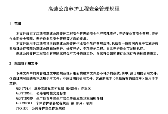DB36/T 2032-2024 高速公路养护工程安全管理规程规定了江西省高速公路养护工程安全管理的安全生产管理责任、养护作业前安全管理、养扩