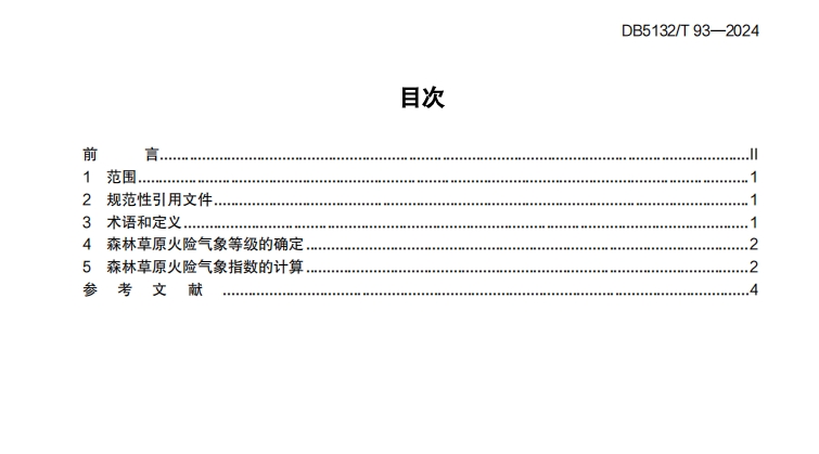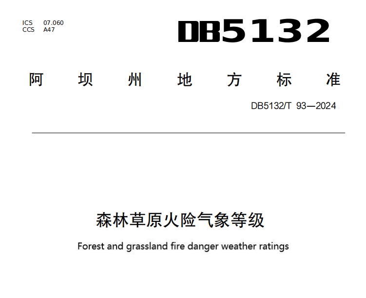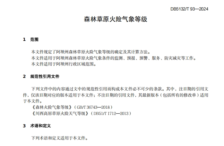 DB5132T+93-2024《森林草原火险气象等级》,本文件规定了阿坝州森林草原火险气象等级的确定及其计算方法。适用于阿坝州森林草原火险气象条件的监测、预报、预警、服务、防灾减灾等工作。