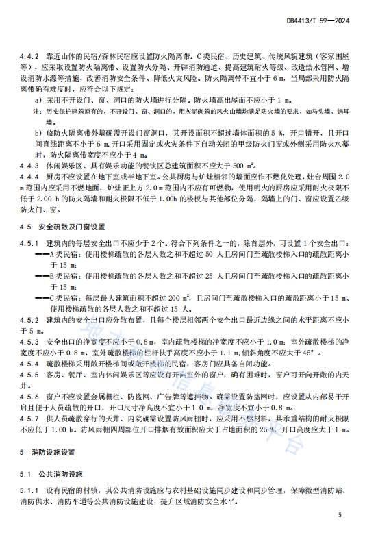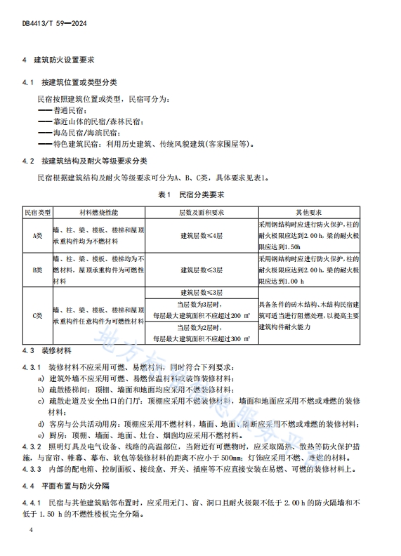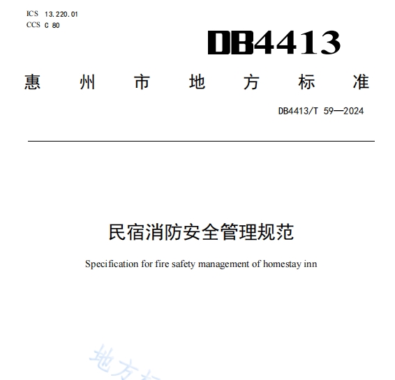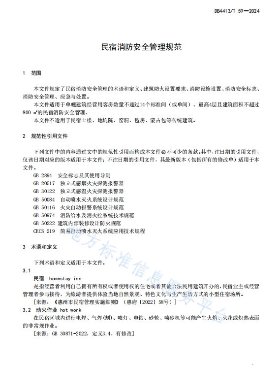 DB4413T 59-2024民宿消防安全管理规范,本文件规定了民宿消防安全管理的术语和定义、建筑防火设置要求、消防设施设置、消防安全标志消防安全管理、应急与处置。适用于单幢建筑经营用客房数量不超过14个标准间(或单间)、最高4层且建筑面积不超过800 的民宿消防安全管理。