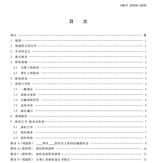 GB/T 22490-2025,生产建设项目水土保持设施验收技术规程,本文件确立了生产建设项目水土保持设施验收的程序,规定了基本要求和验收基础,以及验收准备、查勘与评价、现场验收等技术内容和要求,描述了验收公开,报备及核查的追溯方法。