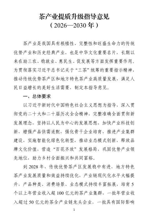 《茶产业提质升级指导意见(2026—2030年)》