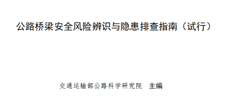 为系统推进公路桥梁风险隐患排查工作,推动公路桥梁安全管理从重点隐患治理向全过程全要素风险管控转变,进一步提升公路桥梁安全运行水平,交通运输部组织技术支持单位编制《公路桥梁安全风险辨识与隐患排查指南(试行)》。